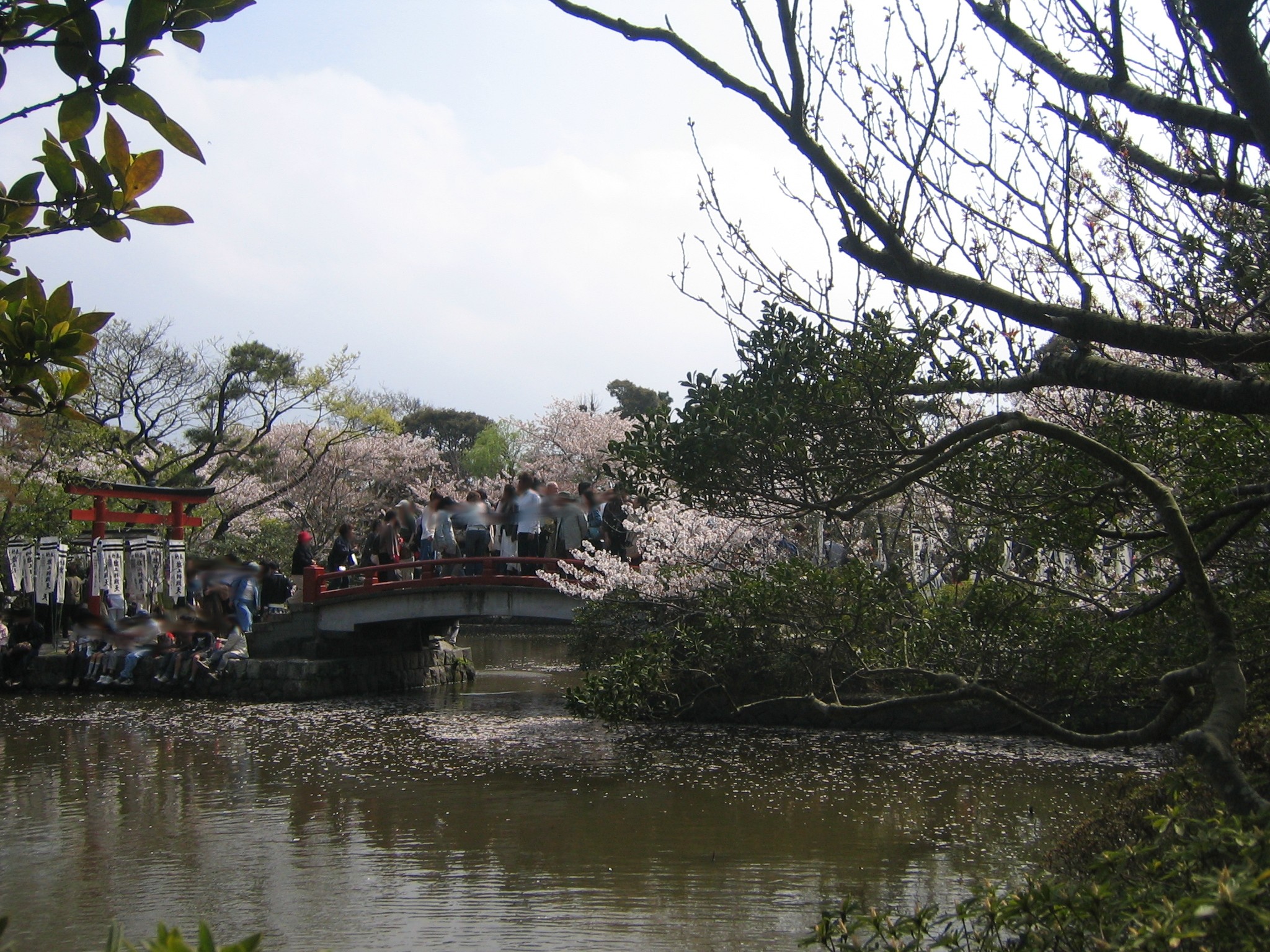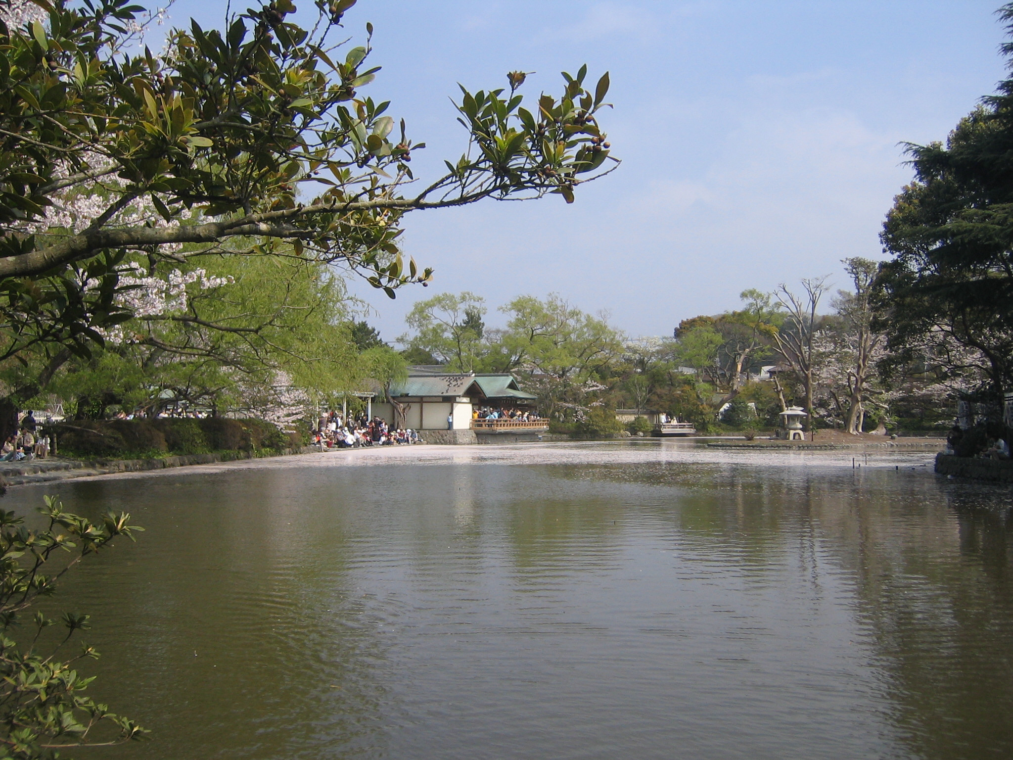 源平池の水面に花弁が浮かんでいます