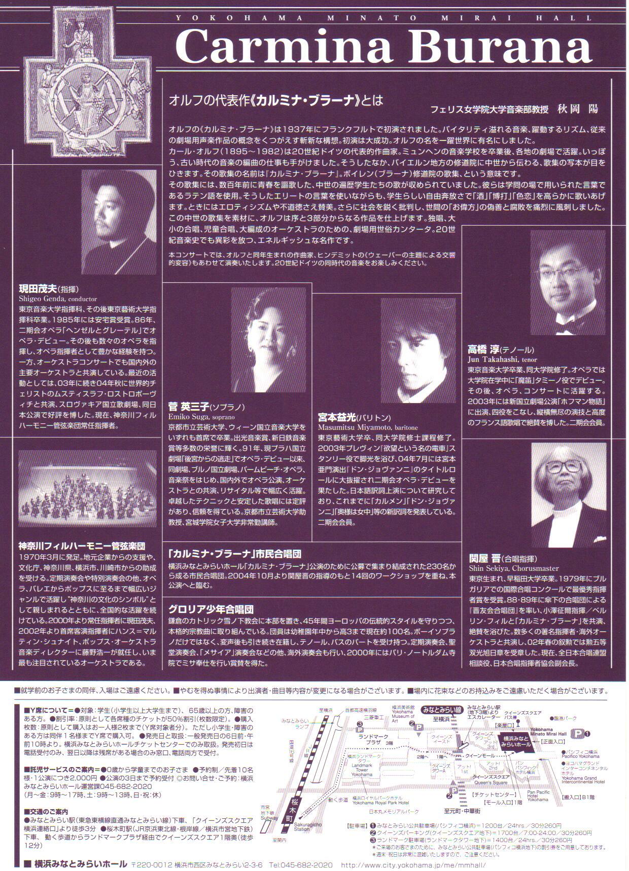 指 揮 :現田茂夫ソプラノ:菅英三子テノール:高橋淳バリトン:宮本益光管弦楽 :神奈川フィルハーモニー管弦楽団合 唱 :「カルミナ・ブラーナ」市民合唱団 グロリア少年合唱団 (合唱指揮:関屋晋)プログラムヒンデミット:ウェーバーの主題による交響的変容オルフ:カルミナ・ブラーナ